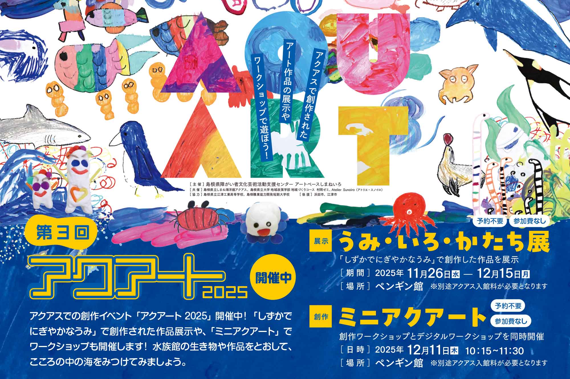 アクアスでの創作イベント「アクアート2025」開催中!「しずかでにぎやかなうみ」で創作された作品展示や、「ミニアクアート」でワークショップも開催します! 水族館の生き物や作品をとおして、こころの中の海をみつけてみましょう […] - [ 作品展 ]令和7年度 島根県障がい者アート作品展のご案内