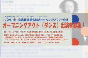 地域のアートと音楽が交差する「音遊びの会 LIVE『音のグラングラン』」にあわせて、当日限定の出店ブースがオープンします。レコード販売、クラフト作品、雑貨、アロマ、ファブリックアートなど、多彩なクリエイターが一堂に集結。 […] - [出演者募集]オープニングアクト(ダンス)~1/24(土)@島根県民会館大ホール:バリアフリー公演 ~[出演者募集]オープニングアクト(ダンス)