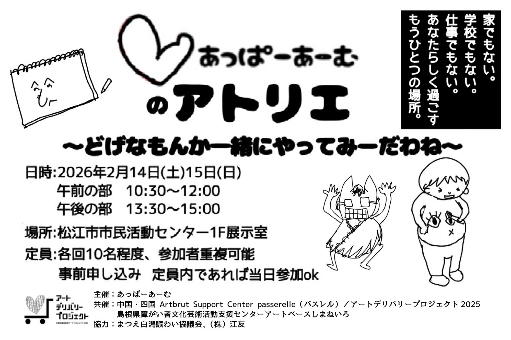 「あっぱーあーむのアトリエ」は、子どもから大人まで、障がいの有無を問わず、誰もが自由に表現できるインクルーシブな創作アトリエです。絵の具やクレヨン、ペンや画用紙など身近な素材を使って、感じたこと・考えたことをそのままに自由に創作してみよう!