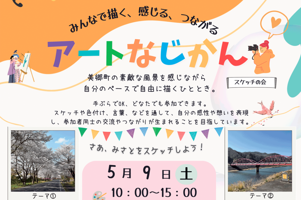 美郷町の素敵な風景を感じながら、自分のペースで自由に描くアートイベントです。色鉛筆や水彩などを使って、スケッチや色付け、言葉による表現など、さまざまな方法で楽しむことができます。手ぶらで参加でき、絵が苦手な方でも気軽にご参加いただけます... -